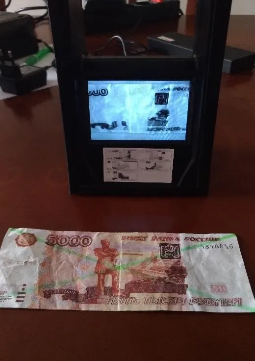 Итог. На видео и фото видно, что детектор одинаково подсвечивает и подлинную купюру, и качественную фальшивку. Прибор справился только с «грубой» подделкой.